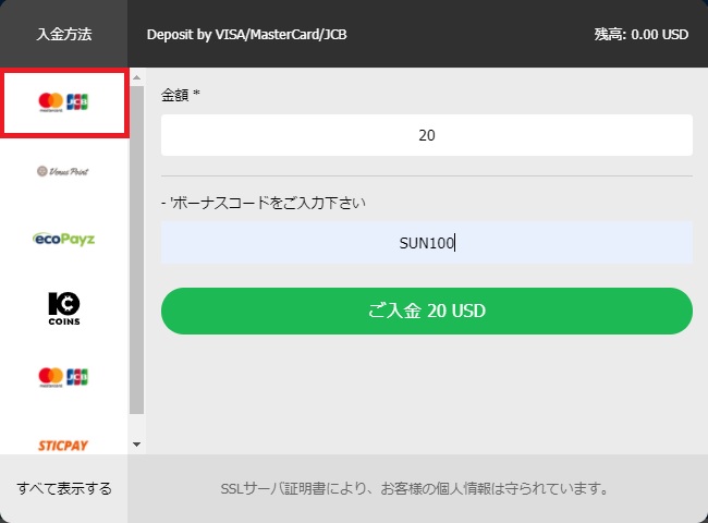 ボーナスコード:『SPORT88888』 を入力して、黄緑色の、『ご入金』 ボタンを押しましょう。