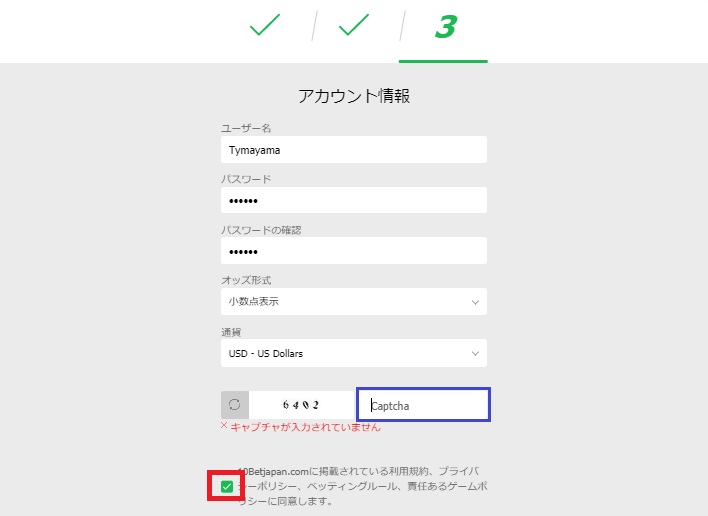 ※ 黄緑色の、『アカウント作成』 ボタンが、チェックボックスの下に/入りきらなかったです...